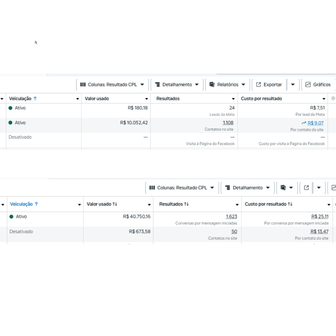 Esses resultados são centenas de leads qualificados gerados na Meta (Facebook/Instagram) com um custo por lead super competitivo. Esse é o tipo de resultado que você também terá com a estratégia certa.